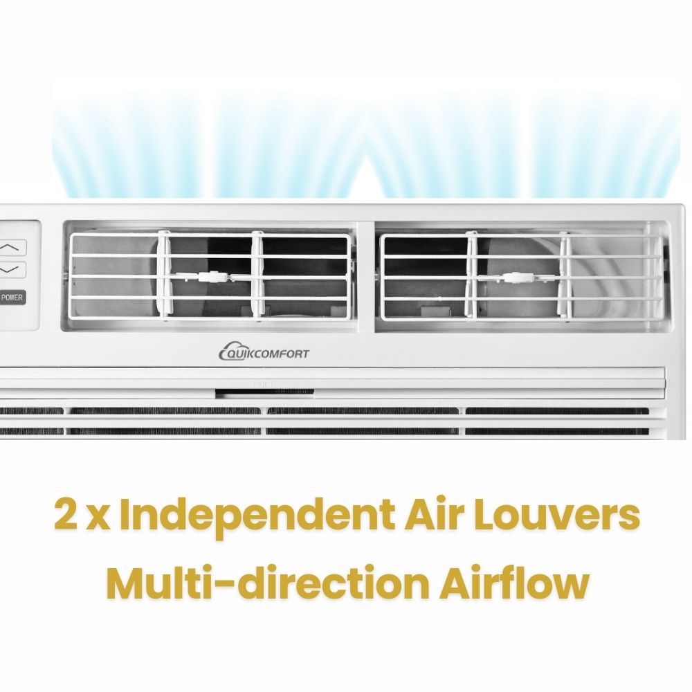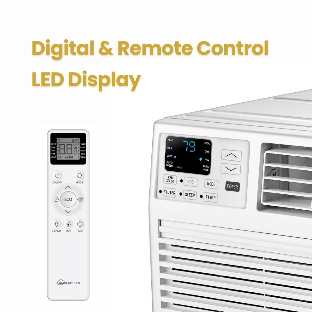QuikComfort thru-the-wall air conditioner is the ultimate cooling solution for your space. Engineered with advanced technology, this unit provides powerful and efficient cooling performance while seamlessly integrating into your wall with standard wall sleeve. With adjustable temperature settings, you have complete control over your comfort, allowing you to create the perfect climate for your space. This unit also features a convenient remote control, enabling you to effortlessly adjust settings from anywhere in the room. Enjoy the benefits of directional airflow, ensuring even and consistent cooling throughout the area. Additionally, it offers energy-saving modes, programmable timer, and sleep mode for optimal comfort and energy efficiency. It also comes with built-in strip heating element for all year round use.